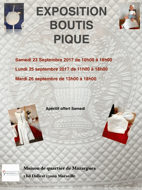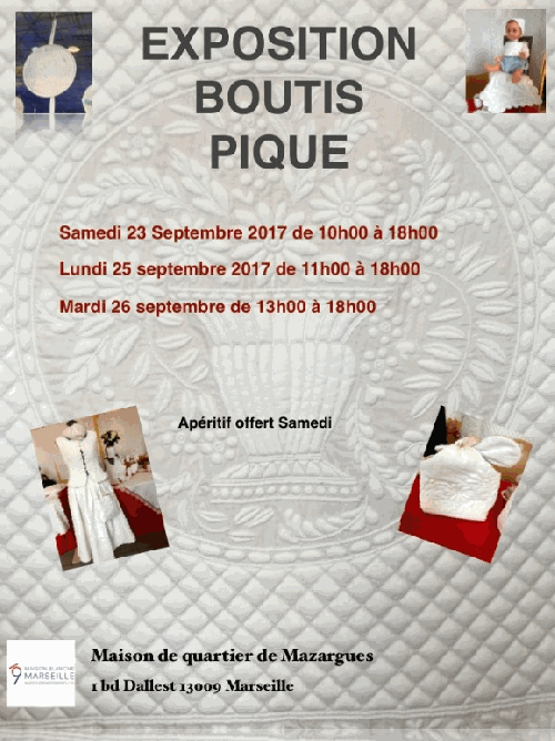 Trois jours d’exposition avec des démonstrations de boutis et de piqué Marseillais, puis une exposition plus réduite jusqu’au 6 octobre.