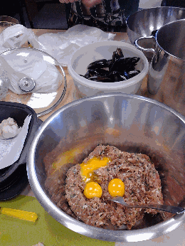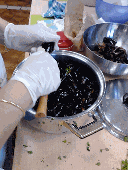 Beaucoup de "rigolade" notamment pour attacher les moules car, selon la tradition, la ficelle était de mise : interdiction des élastiques !!!!
