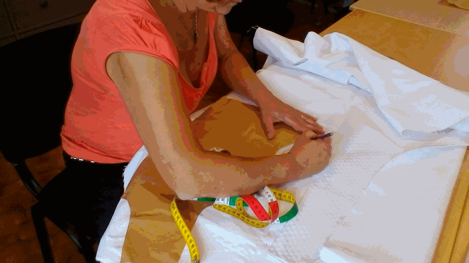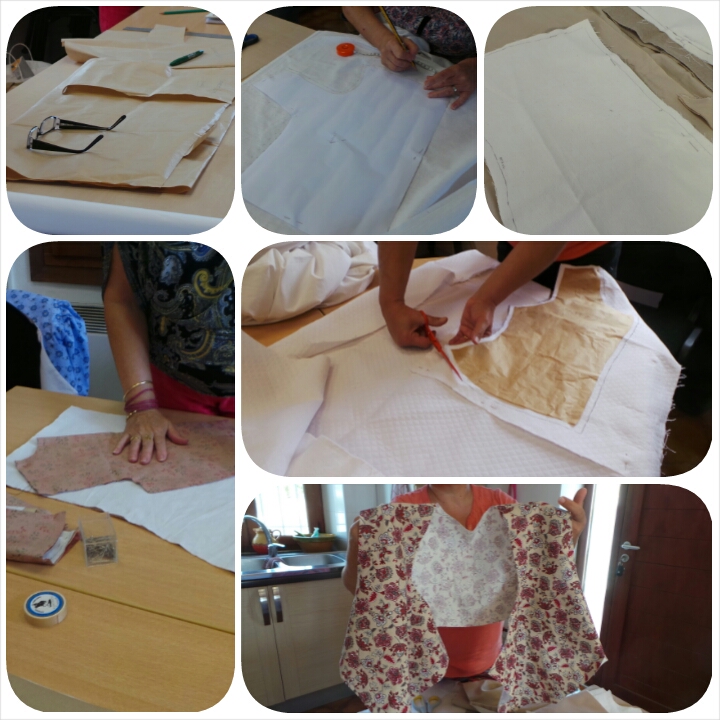 Nous apprenons à dessiner le patron sur papier, puis sur du tissus (du drap) pour bien l'ajuster à la taille de chacune.